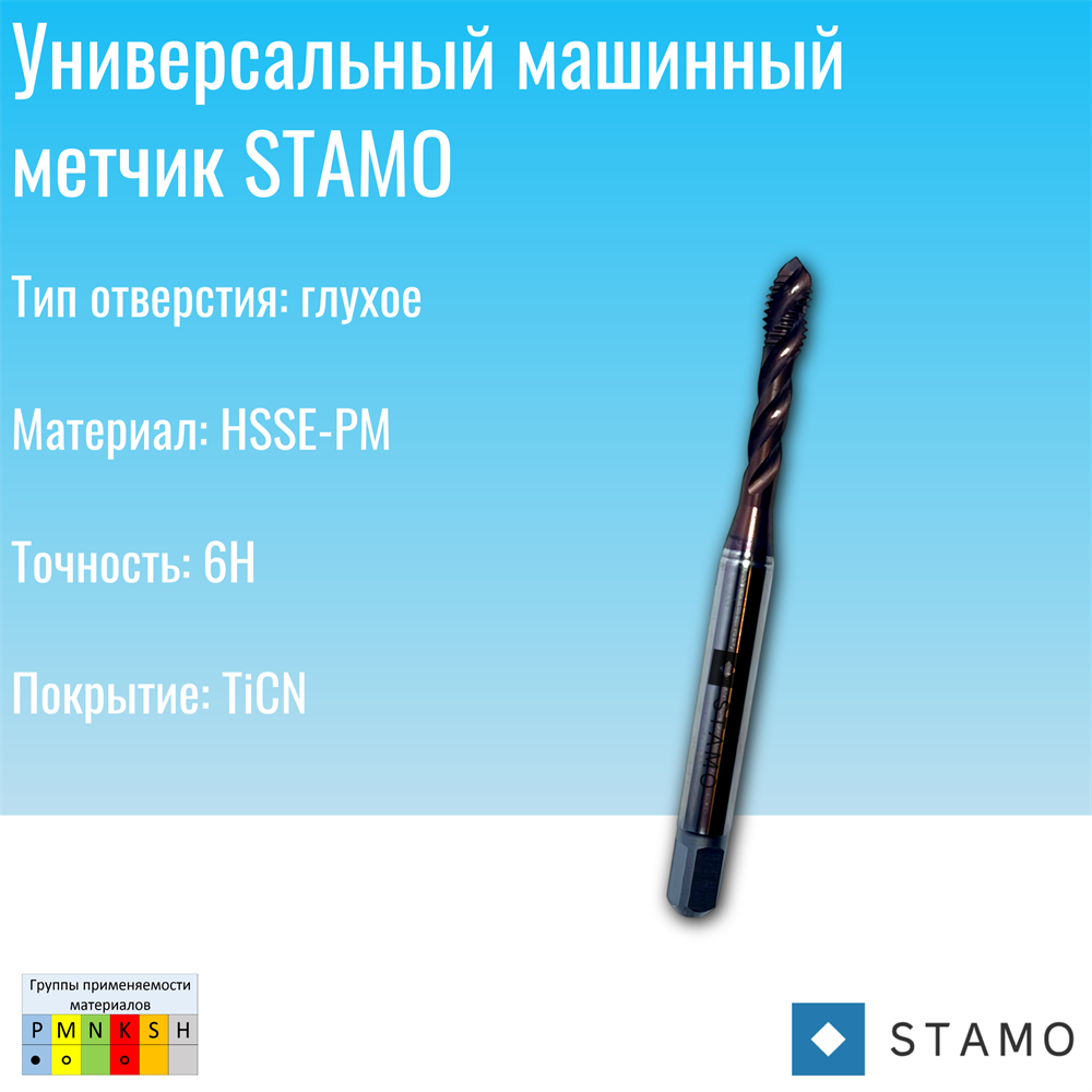 Универсальный машинный метчик для обработки сталей (R ≤ 1000 Н/мм2), из HSSE, для глухих отверстий. Глубина резьбы - 3xD. Точность - 6H. Покрытие - TiCN (карбонитрид титана).